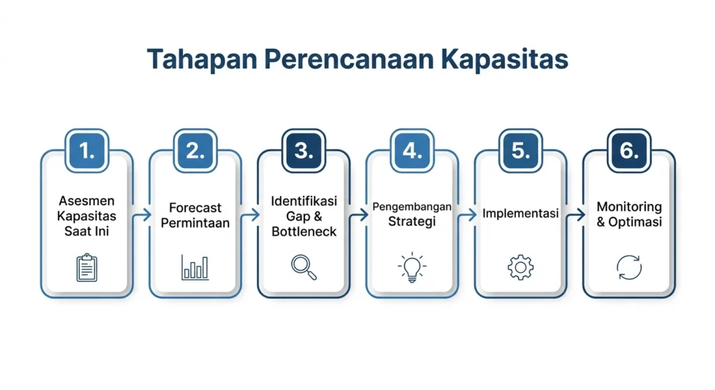 Memahami konsep dan strategi perencanaan kapasitas adalah langkah pertama yang penting, tetapi pemahaman teoritis saja tidak akan mengubah apapun di lantai produksi. Yang lebih menentukan adalah bagaimana perusahaan menerjemahkan pemahaman tersebut ke dalam serangkaian langkah konkret yang dapat dieksekusi secara konsisten. Berikut adalah enam tahapan proses perencanaan kapasitas yang dapat dijadikan kerangka kerja oleh perusahaan manufaktur.